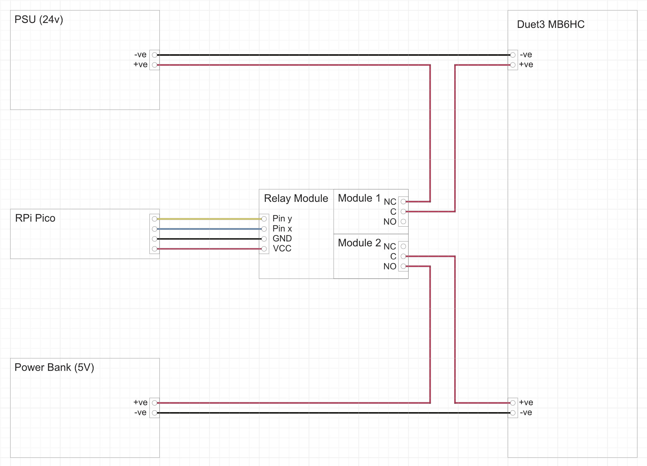 The control board can also run with a 5V (USB) power supply (but not to do any work, just when configuring it) and I was hoping to use this as a way of keeping the board powered long enough to save the file, but both shouldn't provide power at the same time, so I thought of using a pair of relays and a microcontroller, to switch from one supply to the other, if the 24V fails - and it sounded so simple.