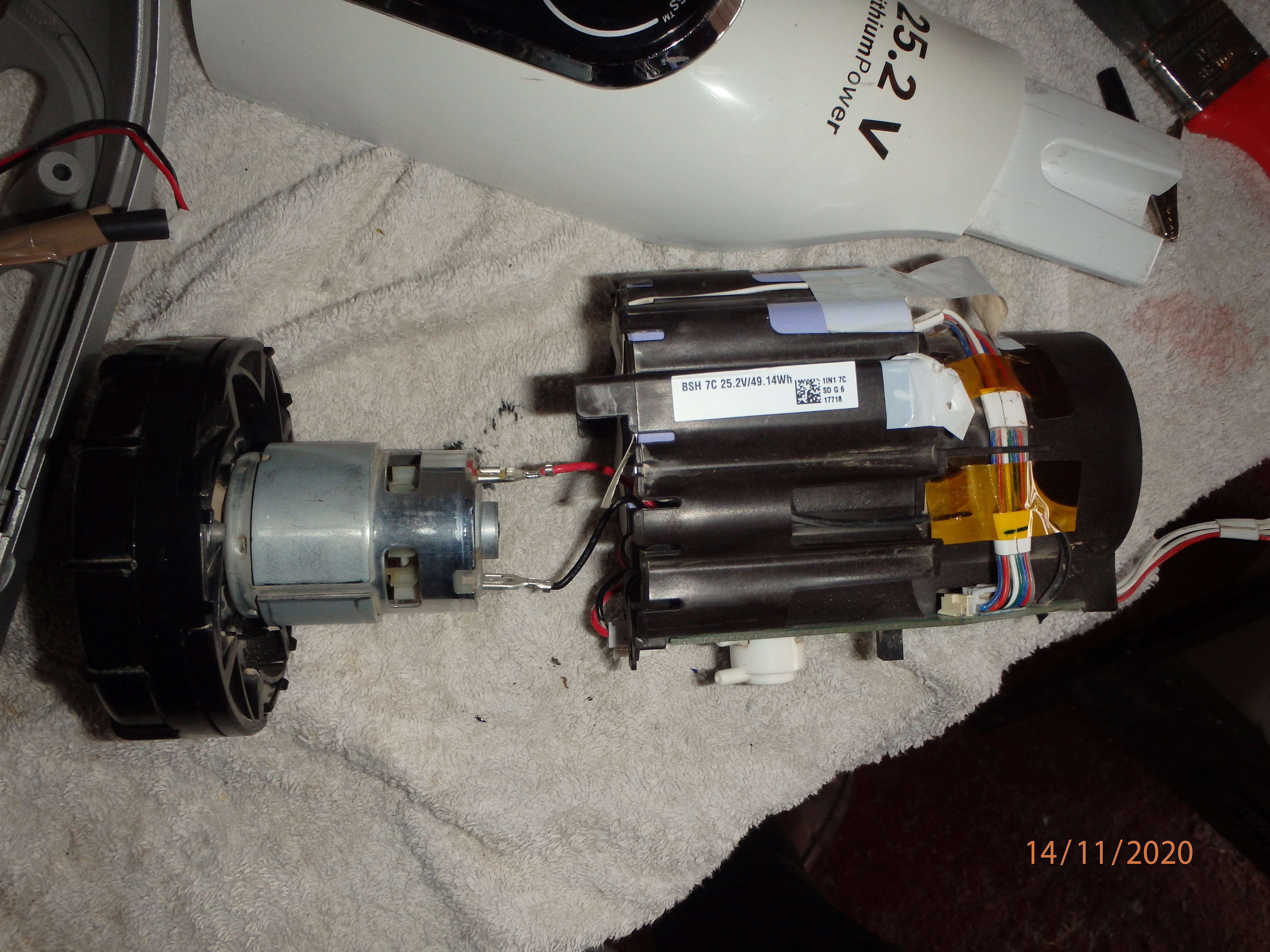 Being a mean Scot, I started on the non-working part of the ebay machine. It runs at full power and stops suddenly after 2 min. I stripped it down (a pain, 2 youtube videos). Each cell gives 4v plus and the overall pack 29.2v. I was expecting the pack to be faulty, I have replaced cells in drills. Cleaned everything, the contacts with alcohol, dust filters & motherboard, checked all connections and tighten any looseness, split the motor & cleaned the stator, the bearing, etc. Assembled and checked: no change.